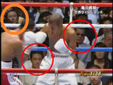 四十分近く一方的に殴られた後、ランダエタさんの手に渡るはずだったチャンピオンベルトを奪い取り、暴力団とみられる数人の男に囲まれながら警察の制止を振り切り、在京放送局(TBS)へ逃げ込んだ。しばらくTBSに立てこもった後裏口から抜け出し、現在は都内を逃げ回っている模様。警察は逮捕状を持って行方を追っている。